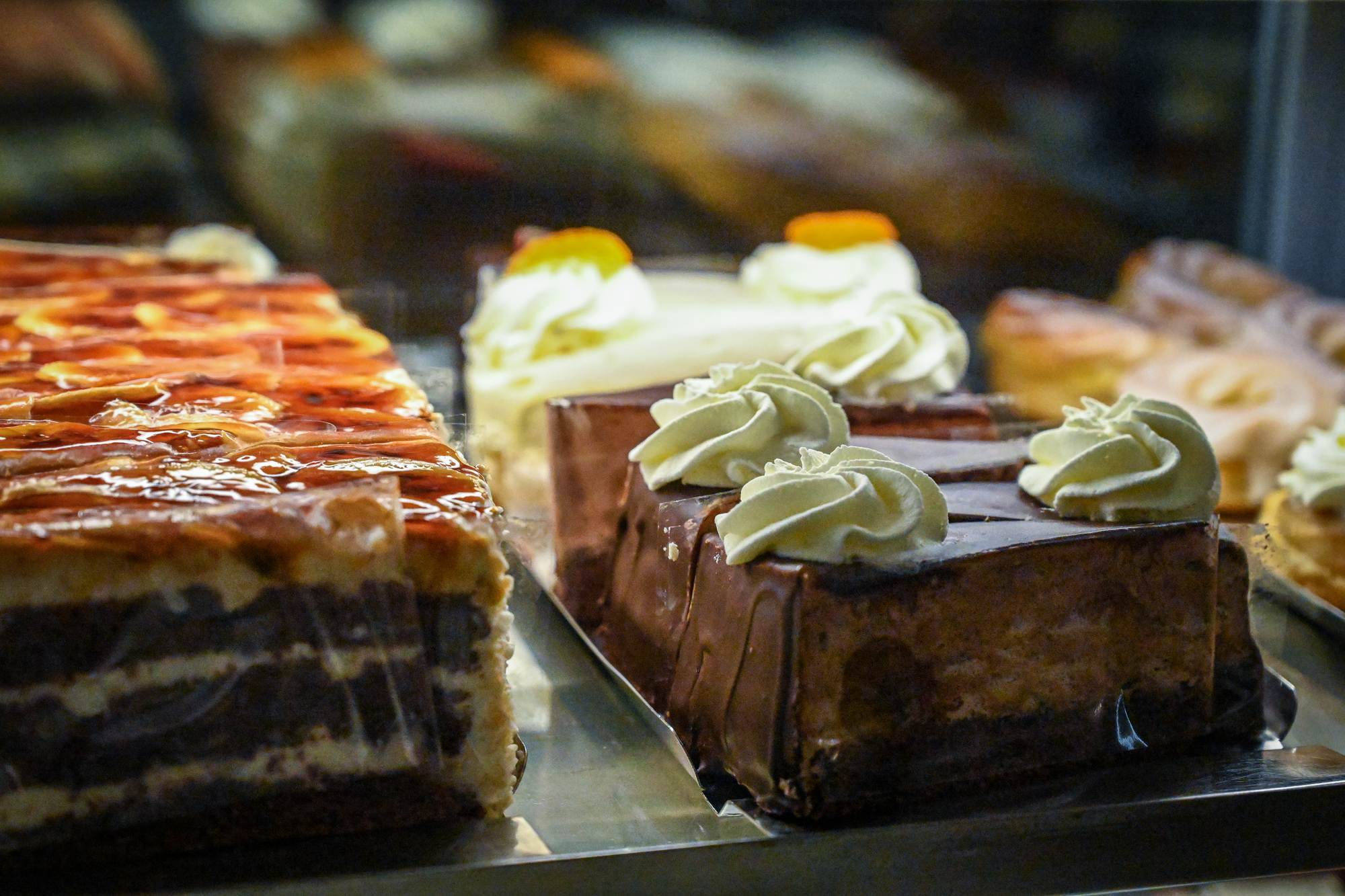 V prosklených vitrínách najdete klasické cukrářské speciality i dezerty podle současných trendů.